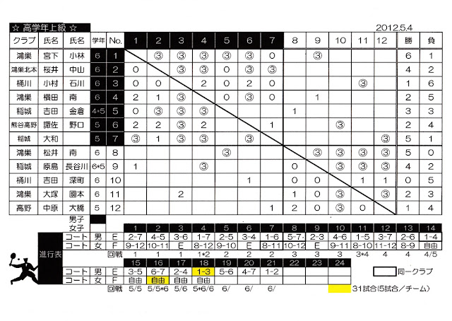 対戦結果は、高野ジュニアソフトテニススポーツ少年団様の古田監督より頂戴致しました。下記の対戦表はクリックすると大きくなって見易くなります。尚、この対戦表のpdfファイルを鴻巣パンジーテニススポーツ少年団のホームページの大会の記録(平成24年度)に置きましたので必要に応じてそちらも参照する様にして下さい。